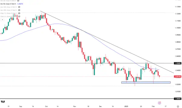 欧洲对美国的巨大贸易顺差令其很有可能成为特朗普的下一个目标。对欧元来说,阻力最小的方向仍是下行,首先关注前低1.0220附近的支撑,跌破后将打开通往平价水平的大门。反弹方向,均线和趋势线等在1.04/05一带构成了强大的压力。