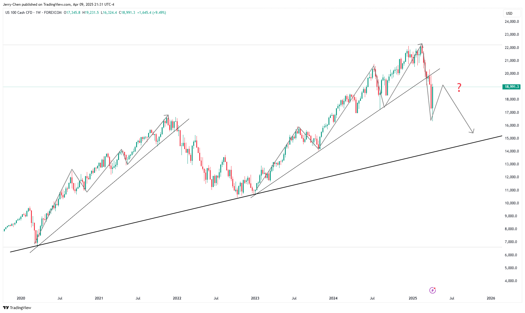 但若特朗普继续通过关税冲击全球经济,纳斯达克100指数或最终跌向14000点附近。