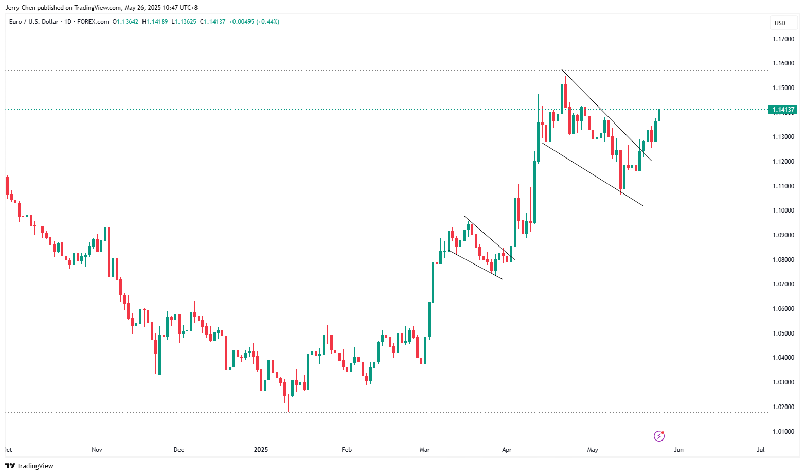 特朗普对欧盟关税的180°大反转有望帮助欧元延续升势。本周多头的首要目标是4月高点1.1573,突破后将打开前往1.1700-1.1800区域的大门。